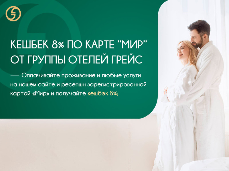 Успейте забронировать номер и воспользоваться любыми услугами в отелях группы "Грейс" в период с 23 сентября по 31 декабря 2022 года и получите кэшбэк 8%
